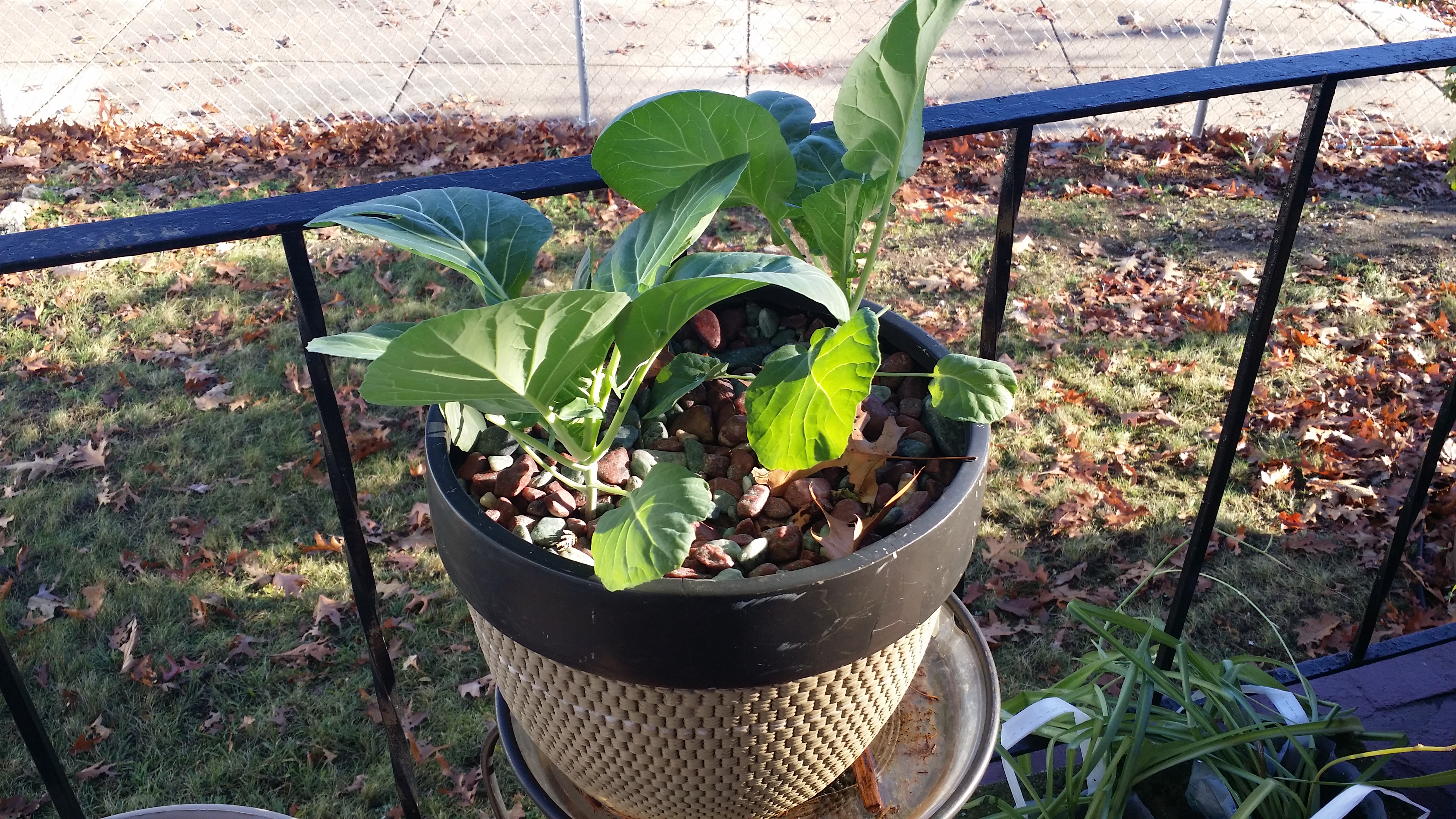 Some one, some family, will eat well, I thought. I was also inspired to try my hand at growing this green admittedly not one of my favorites. I bought a starter plant from a local farm, re-potted it and aside from lackadaisical watering, basically left alone. Yesterday, it rained, heavily. This is what the plant looked like earlier today: